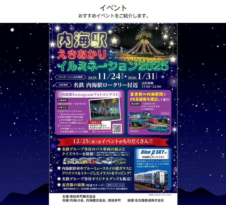 「内海駅えきあかりイルミネーション2025」を11/24~2026/1/31に名鉄内海駅(南知多町内海)で開催。